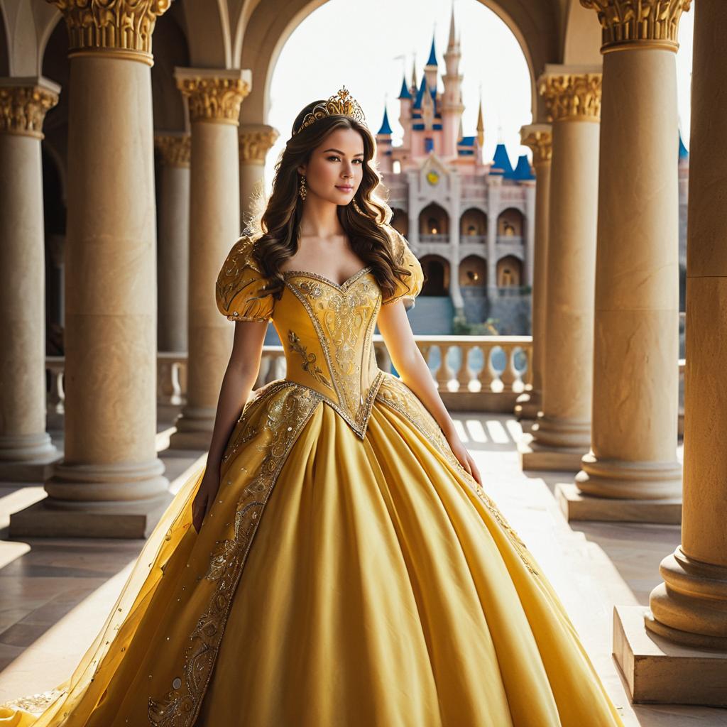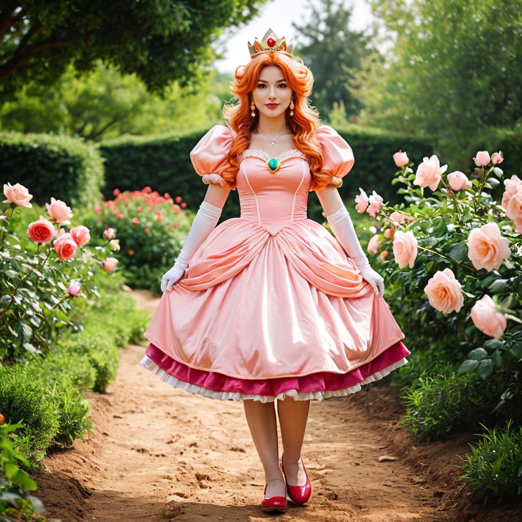 Princess disney costume, digital artwork, princess with long red hair, wearing a pink and gold corset dress with puffed sleeves, large skirt, crown with red gem, smiling, standing in front of a fairy tale castle with blue turrets, bright sunlight, colorful flowers in a large planter to the right, lush greenery in the background, detailed ures, realistic style, highly detailed, semi-realistic lighting, fantasy theme, Disney Princess vibes
