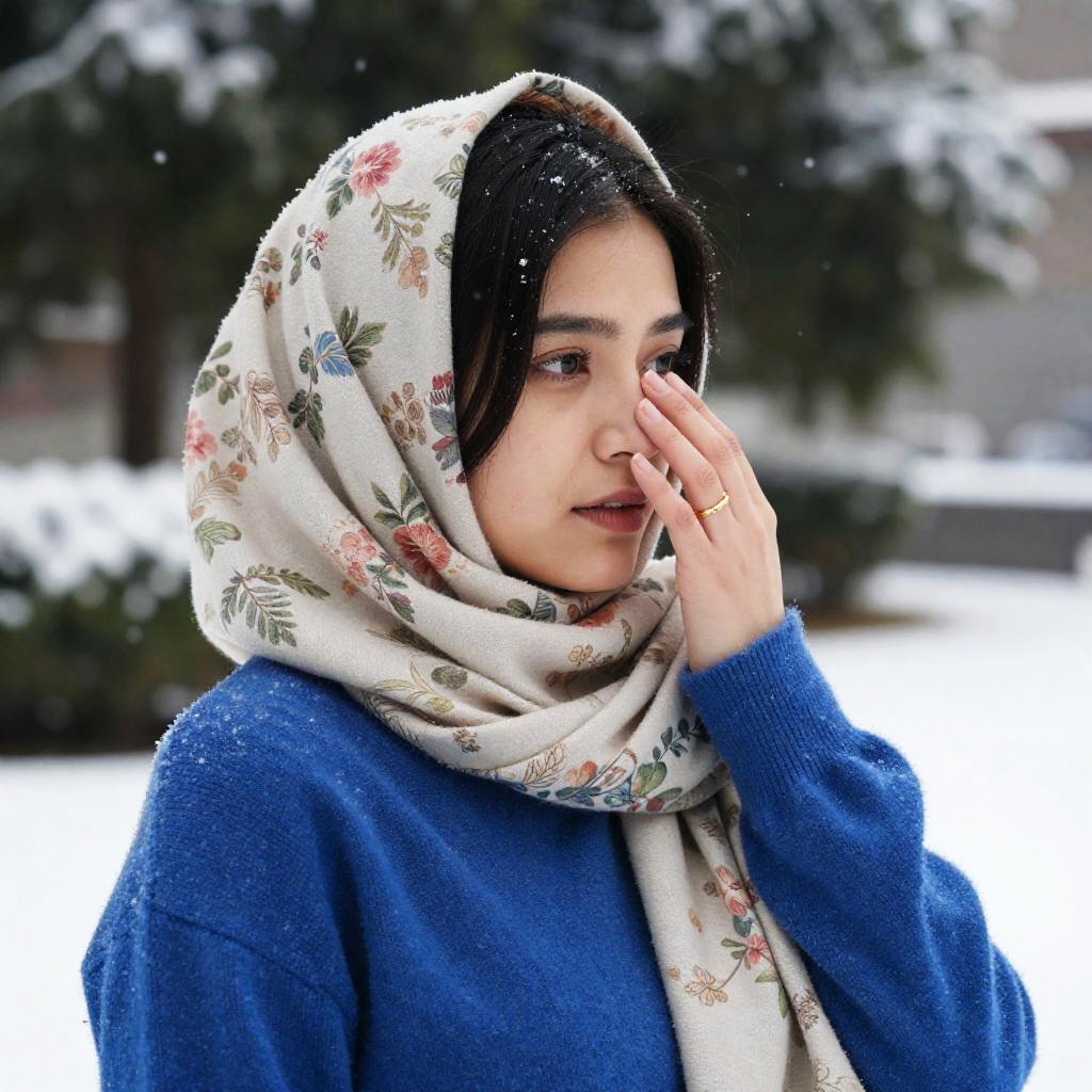 Woman with dark hair covered by a floral-patterned headscarf, wearing a blue sweater, stands in a snowy outdoor setting. She holds her face with one hand, wearing a gold ring. Snow falls around her, with greenery and snow-covered ground in the background. Her expression is thoughtful.