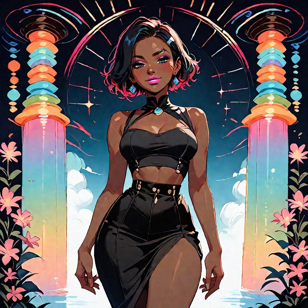 Score_9, score_8_up, score_8, medium breasts, cute, eyelashes, aaRiju, dark skin, midriff, black dress, solo, smiling, smug, looking at viewer, cowboy shot