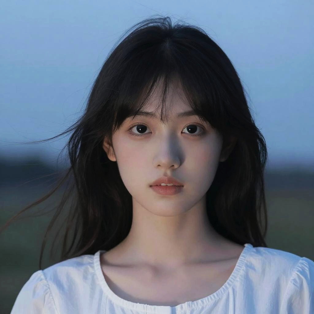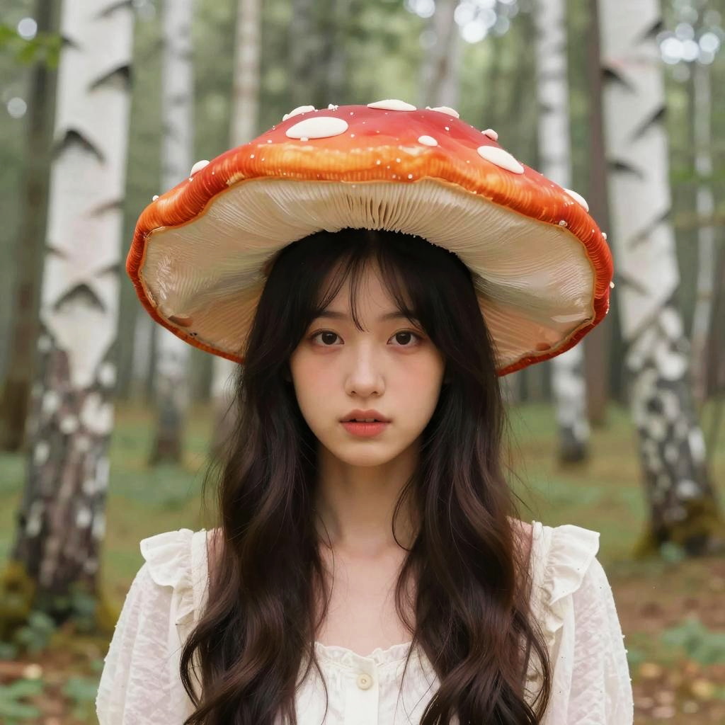 Portrait of a young Asian woman with long dark hair wearing a large red and white mushroom-shaped hat, standing in a serene birch forest background. She is dressed in a white ruffled blouse, blending fantasy elements with natural scenery.