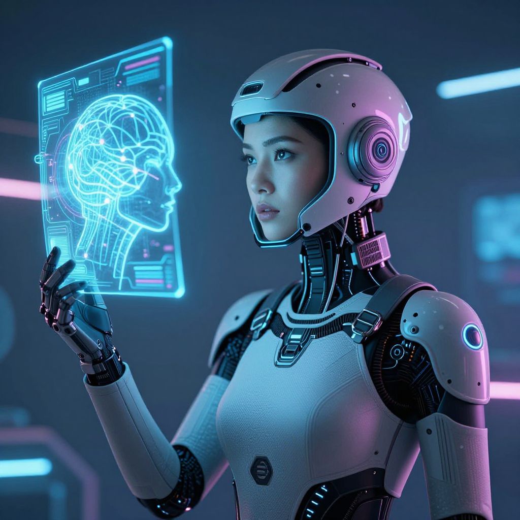 A woman in a futuristic, cybernetic outfit with a helmet and a glowing computer screen, representing mind control through artificial intelligence and cyber ecstasy.