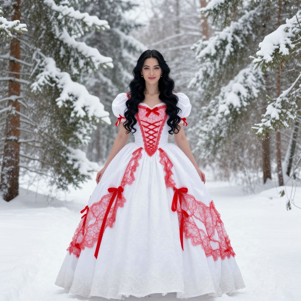 Photograph of a beautiful woman with long, wavy black hair standing in a snowy forest. She's wearing an elaborate, white ball gown with a red lace overlay and red ribbon details. The dress has puffed sleeves and a voluminous skirt. Snow-covered pine trees surround her, creating a magical winter wonderland backdrop. She's smiling softly, looking straight at the camera.
