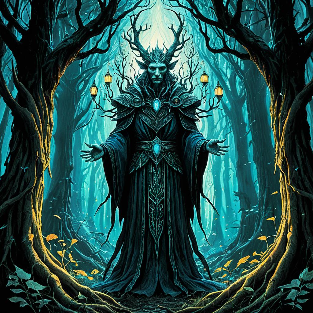 A breathtaking 3D pencil drawing of an enigmatic fae lord, ruler of twisted woods, eyes glowing with ancient magic, standing beneath a canopy of bioluminescent trees, saturated colors, digital art, catalogue raisonné, Autodesk Maya, Cinema 4D, hyperrealism, ultra detailed, 3-point perspective, by Brian Froud