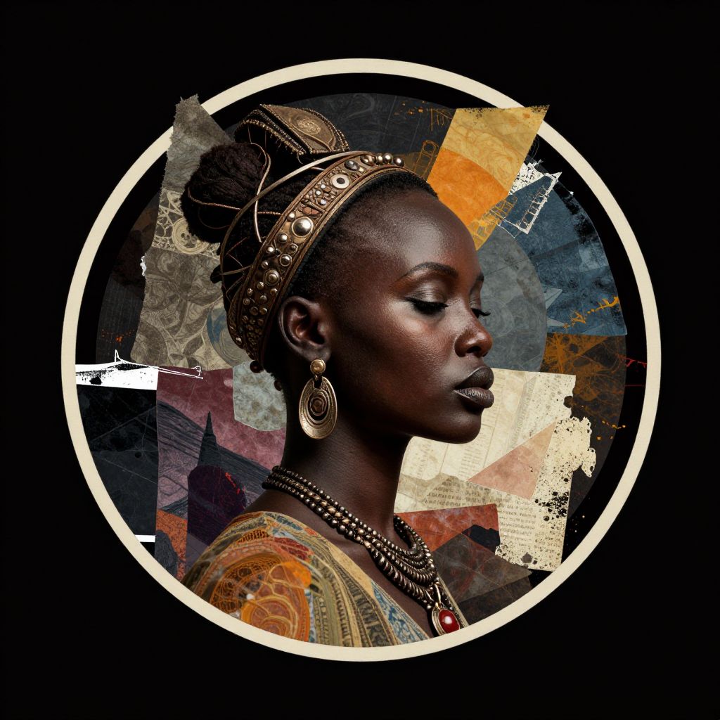 Colorful abstract oil painting portraying a strong black woman inspired by the Black Panther movement. She wears a turquoise and gold embroidered armor-like outfit with lace sleeves, complemented by a traditional necklace. The textured canvas background features dominant turquoise and gold brush strokes, creating a modern artistic effect.