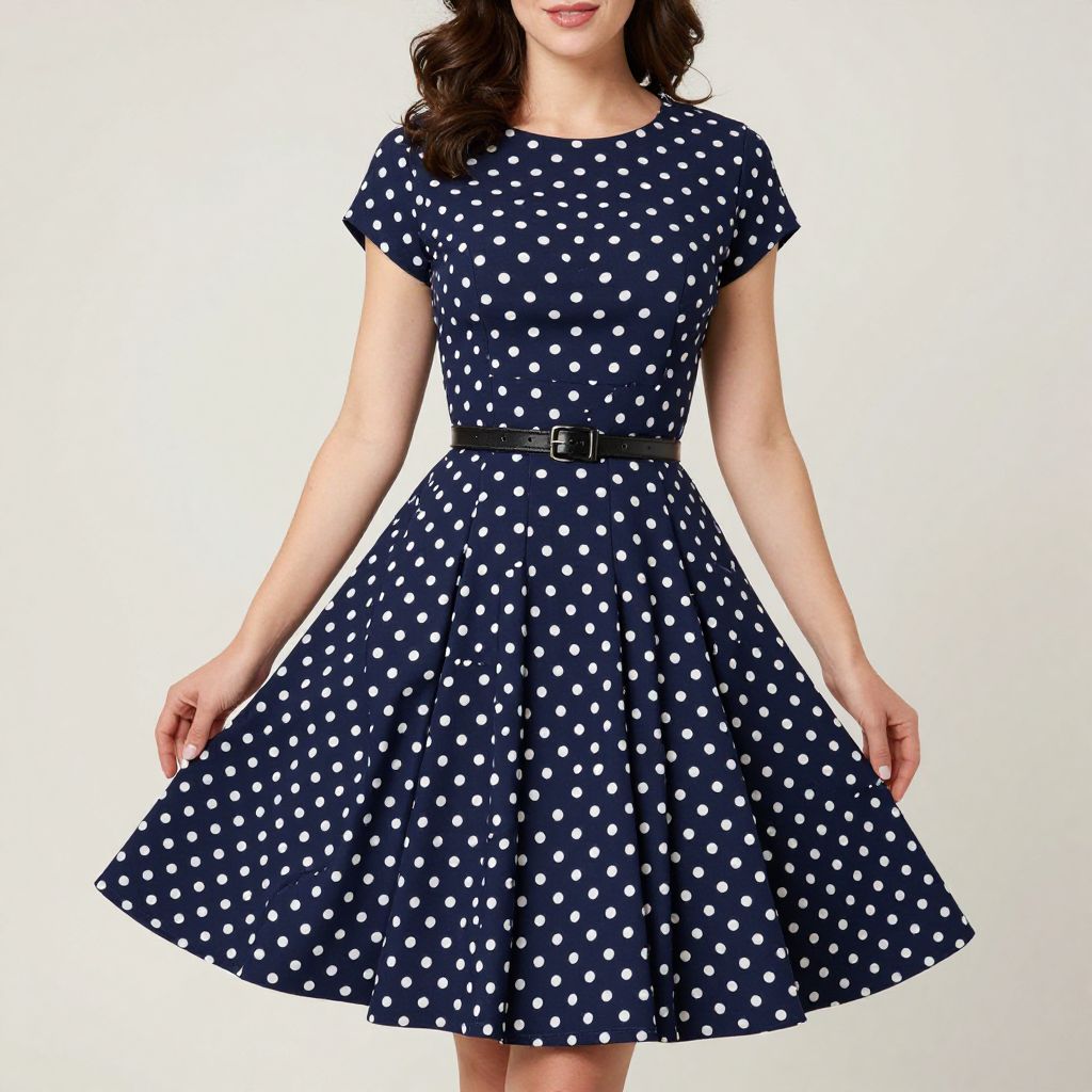 Woman showcasing a navy-blue polka dot dress with short sleeves, a fitted waist accentuated by a black belt, and a flared skirt, embodying 1950s vintage rockabilly style against a plain background.