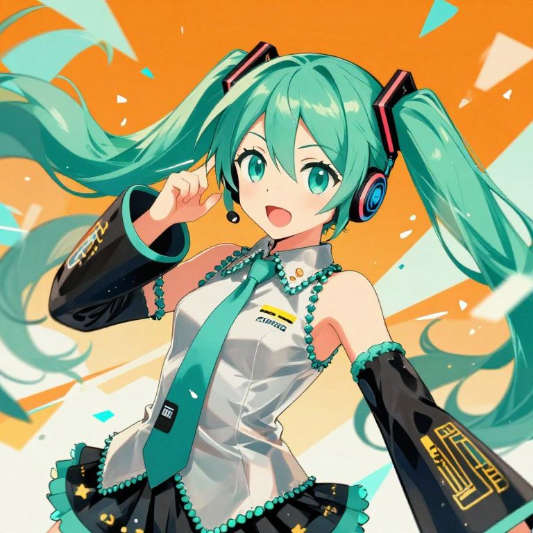 The image is a highly detailed, Studio Ghibli-inspired anime-style illustration featuring Hatsune Miku, a popular virtual singer. The scene is vibrant and dynamic, with a striking color palette dominated by shades of teal and orange. Hatsune Miku, with her iconic green hair and large, expressive blue eyes, is depicted in a dramatic pose, her hair flowing dramatically around her. She is wearing headphones, which add to the sense of immersion and focus. The background is a mix of abstract shapes and fragments, creating a sense of movement and energy. The overall composition is balanced, with Hatsune Miku centrally positioned, drawing the viewer's attention to her expressive face and the intricate details of her headphones and hair. The image is a 8k wallpaper, showcasing the artist's skill in creating a visually stunning and immersive scene.