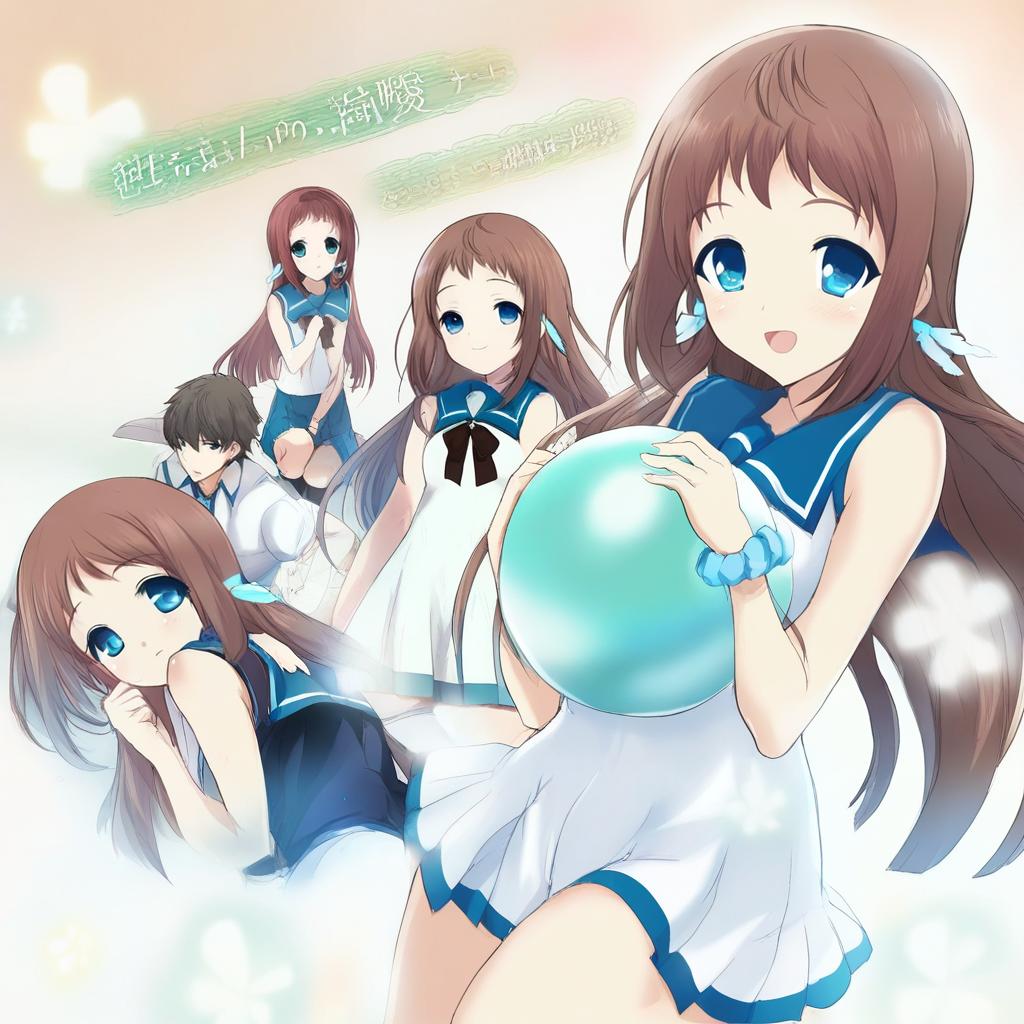 Digital anime illustration of Mukaido Manaka from the series Nagi no Asukara. The character has long brown hair tied with light blue ribbons and striking blue eyes. She is depicted in a white and blue sailor dress uniform typical of Nami Junior High School. The artwork features multiple poses of the girl, some showing her holding a pale blue ball. The background is soft with subtle floral patterns and Japanese text.