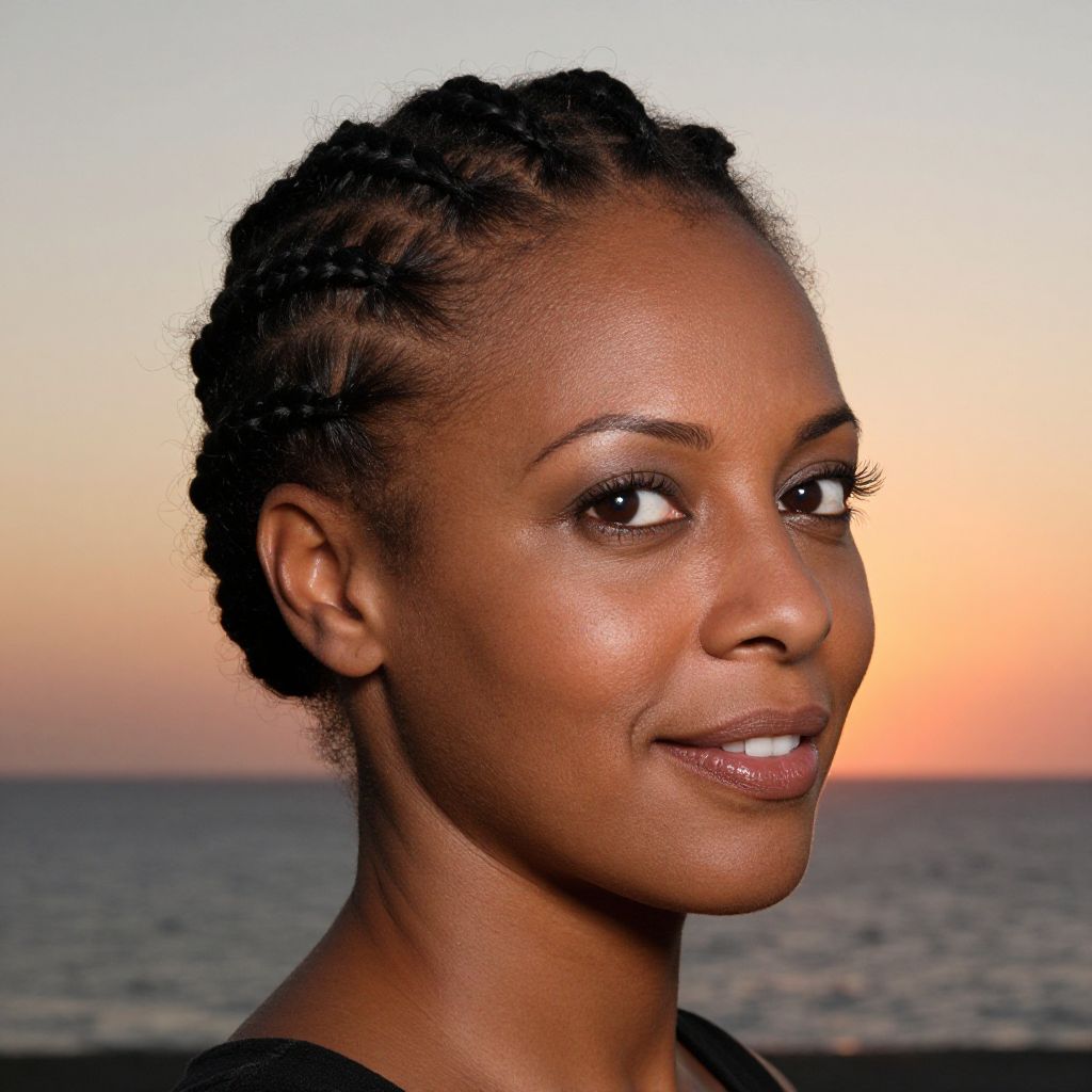 A striking portrait of a 45-year-old Slavic woman with African-American heritage showcases her smooth complexion, full lips, and dark brown eyes framed by thick lashes. Her high cheekbones and warm smile convey wisdom and kindness. Seen in a three-quarter side view, intricate cornrows styled in the shape of a phoenix adorn her scalp, symbolizing rebirth and transformation. Soft natural lighting accentuates subtle lines around her eyes, creating a gradient that blends youthful vitality with life experience. The backdrop of a serene sunset over a peaceful ocean horizon enhances the sense of calm and self-assurance that emanates from her embrace of her unique identity.