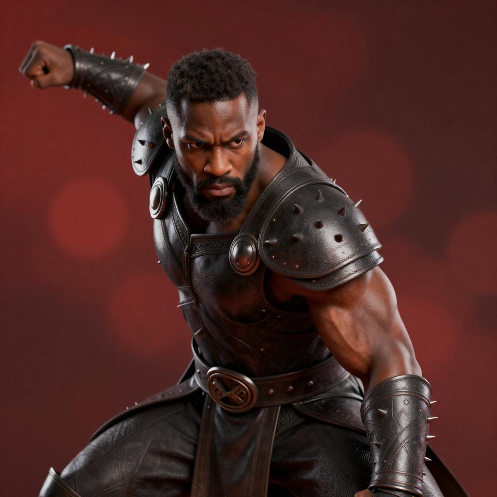Muscular Black man with dark skin wearing futuristic armor with black and white stripes, chest plate, and visor. Wearing wristbands and belt with triangular emblem. Standing in a modern room with fluorescent lights and grid ceiling. Upper body shot, looking forward. Background includes blurred office-like elements.