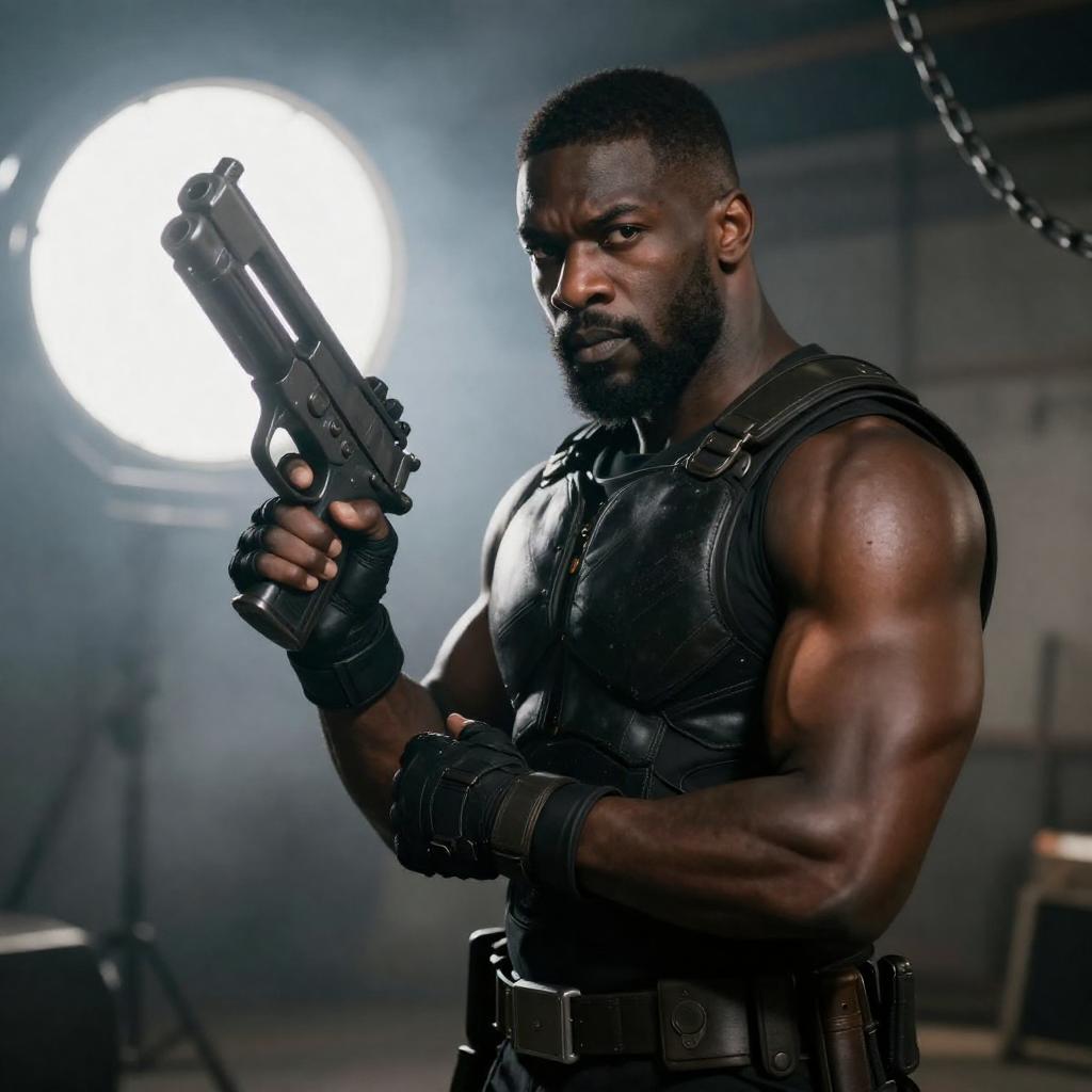 Muscular Black man with dark skin wearing a black and white futuristic chest plate armor, black wristbands, and a belt with a triangular emblem. He has a black visor covering his eyes and stands in a modern office environment with fluorescent lights and a grid ceiling. The image captures an upper-body shot with a blurred office background.