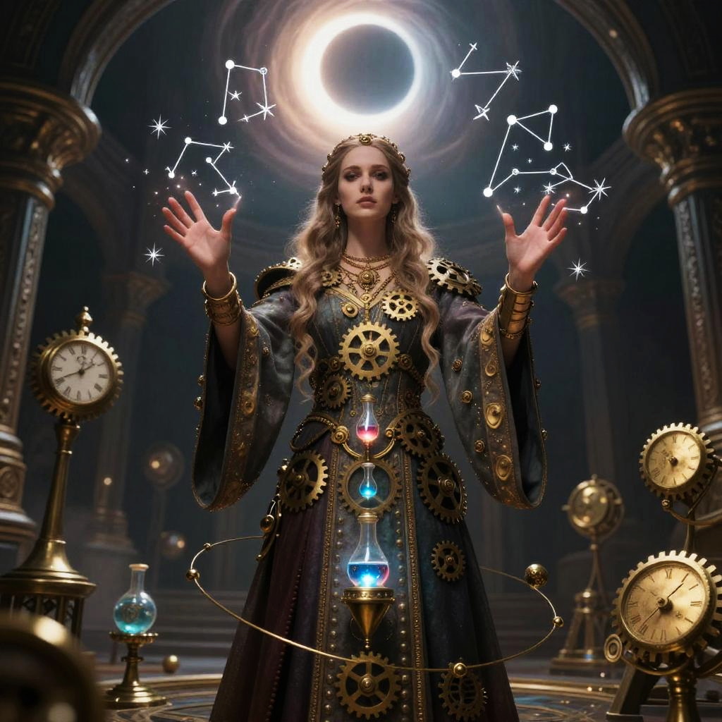 TCG Artwork. A mystical sorceress casting a spell, with morphing silver rune glyphs and tiny clockwork constellations radiating from her hands, wearing alchemy-inspired robes layered with brass gears and glowing reagent vials, in an ancient arcane observatory beneath a swirling eclipse with rotating brass instruments.