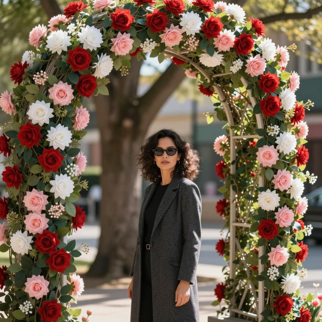 Woman with dark curly hair and sunglasses wearing a black patterned coat standing outdoors through a large arch decorated with red, pink, and white roses and green foliage. The scene is illuminated by bright sunlight with a tree and urban background visible.