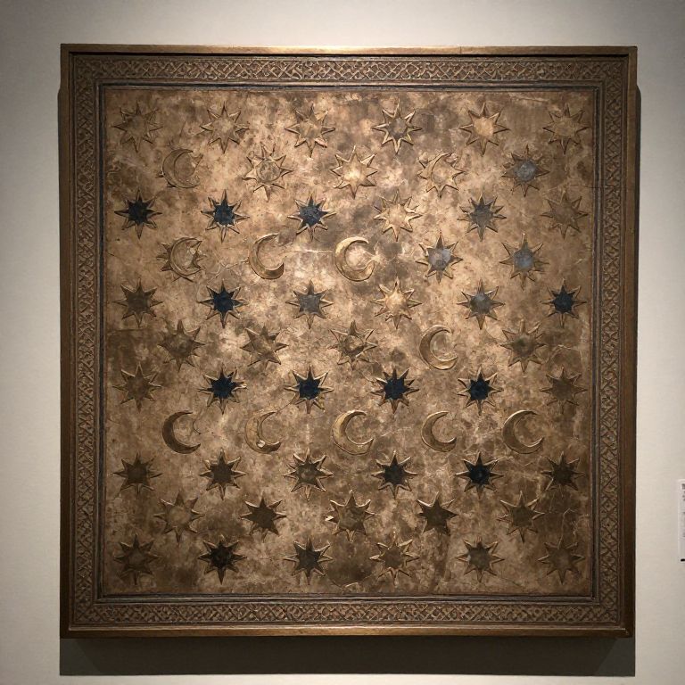 Islamic image prompt: A detailed Islamic artwork panel showing a central pattern of repeating stars and crescents, set within a museum display, with soft shadows and metallic detailing, evoking the beauty and depth of classical Islamic design.