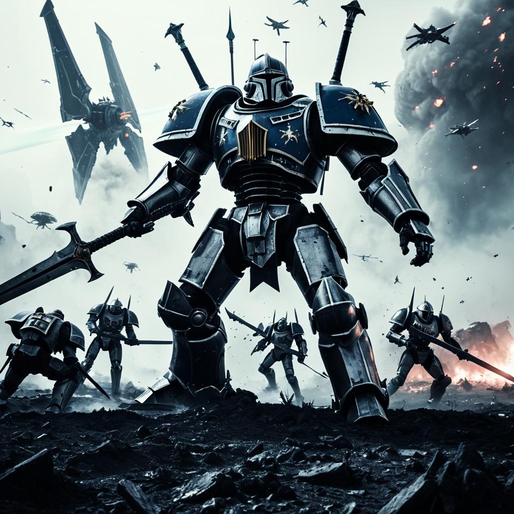 Dynamic battle scene featuring an Imperial Knight towering over the battlefield, with twin-linked rotary autocannons, in a desolate war-torn wasteland, with cracked battle-damaged armor plates.