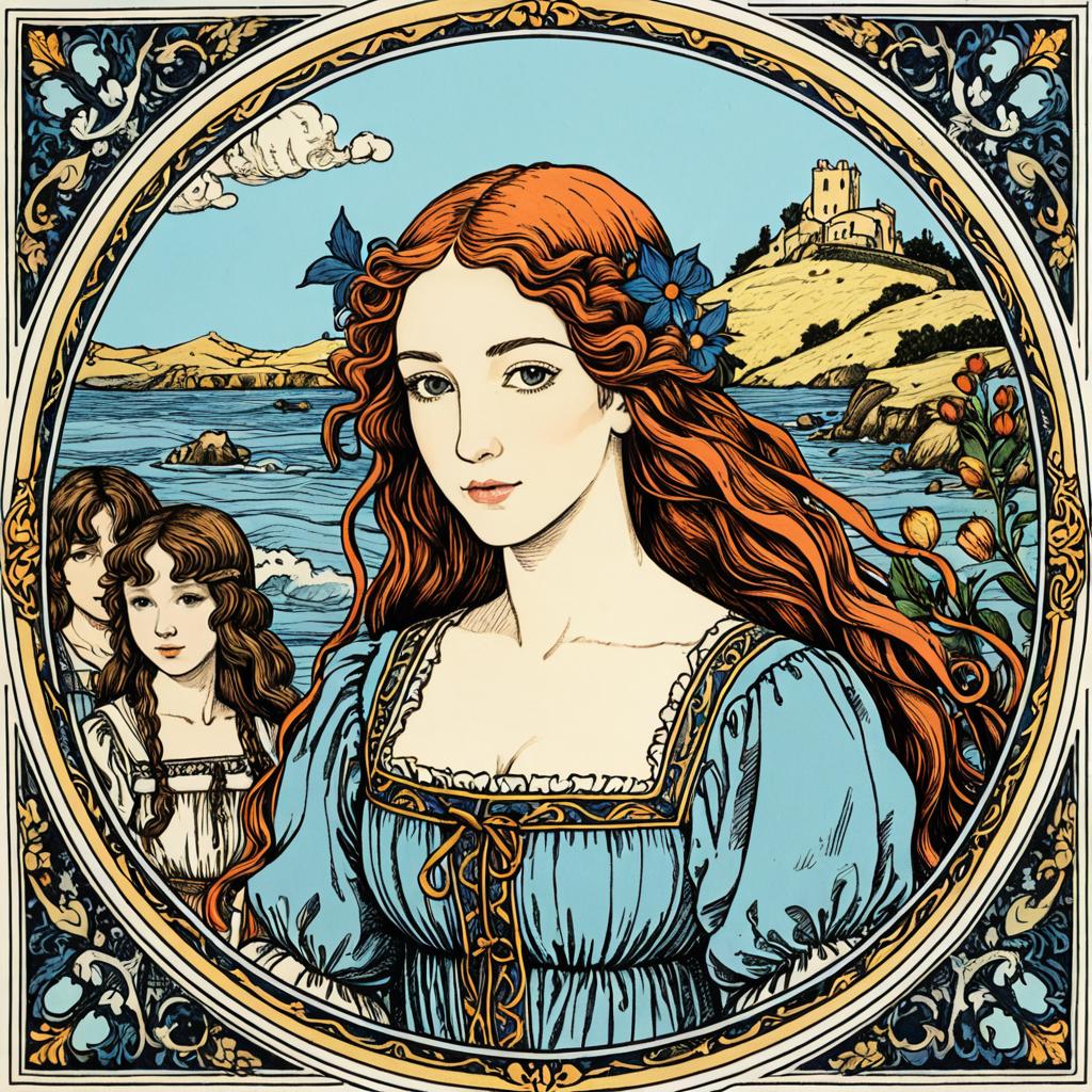 Illustration of a red-haired woman in a blue Renaissance-style dress with intricate gold details. The artwork features fine inking lines and flat colors, combining elements of Pre-Raphaelite and shoujo manga styles. She is adorned with blue flowers in her hair, set against a coastal background with two other figures and a hillside castle. The image is framed with a decorative border inspired by classical art.