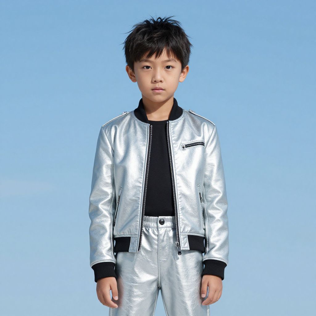 Photograph of a young Asian boy with short, dark, slightly messy hair standing against a bright blue background. He wears a shiny, silver-colored, metallic jacket with black trim and zipper, and matching silver pants with black pockets. The jacket has a black shirt underneath. His expression is neutral, and he looks directly at the camera. The metallic fabric of his outfit reflects light, giving it a futuristic and sleek appearance. The overall style is modern and minimalist, emphasizing the contrast between the silver outfit and the blue background.