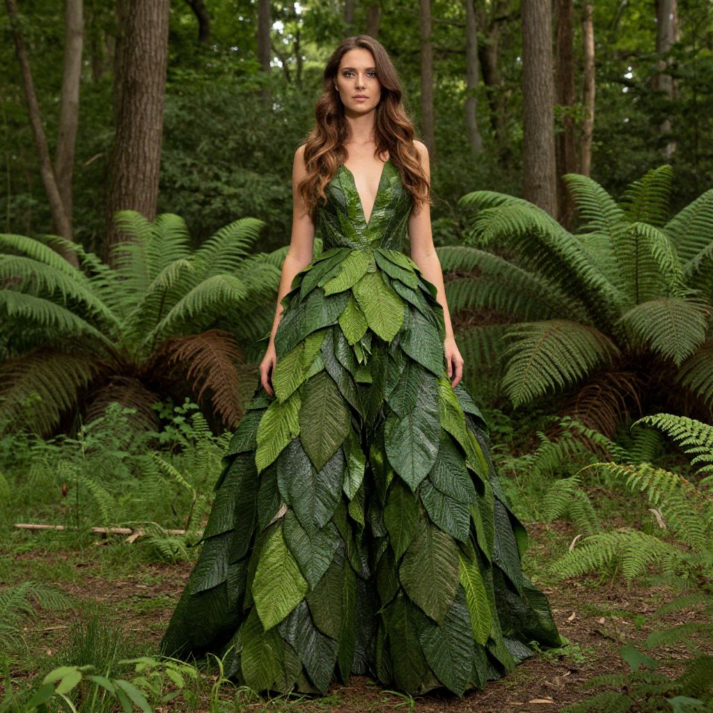Photograph of a tall, slender woman with long, wavy brown hair standing in a lush, forested area. She's wearing a stunning, green leaf-covered gown with a deep V-neck and a voluminous, layered skirt. The dress is intricately designed with large, overlapping leaves, blending seamlessly with the ferns and trees in the background. The forest is dense with tall trees and rich, green foliage.
