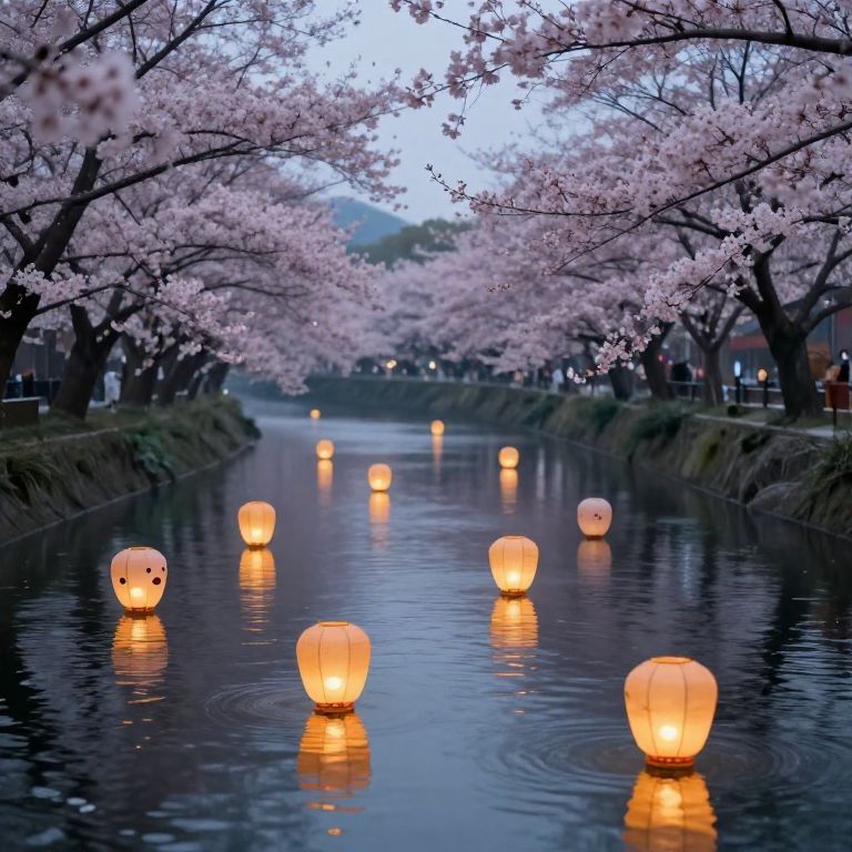 Twelve whimsical lanterns floating gently above a tranquil river at twilight, casting warm light reflections on water surface, serene environment with cherry blossom trees, fantasy art style