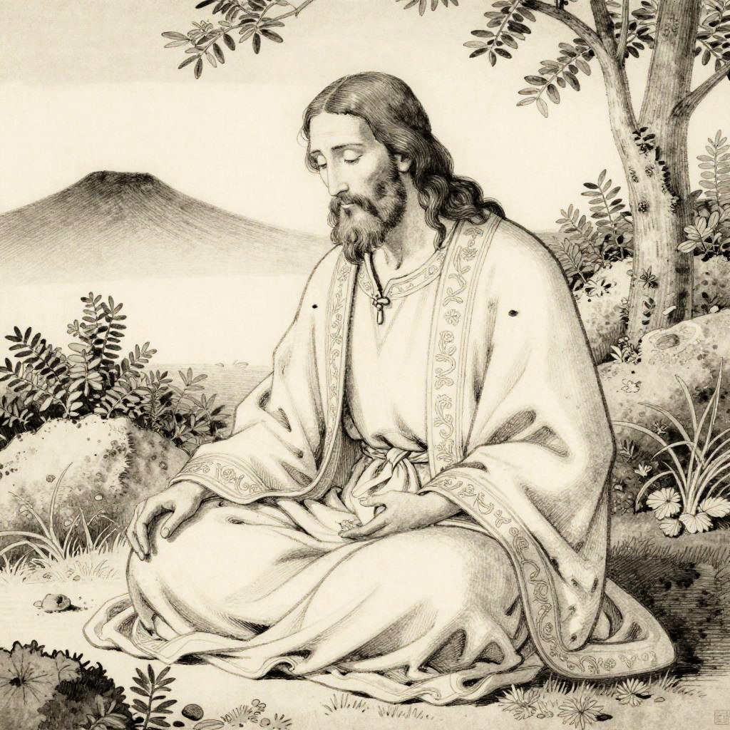 Jesus in the garden of Gethsemane, depicted as a religious elder in a solemn meditative moment. Rendered in classic ink drawing with art by Katsushika Hokusai. Focus on wispy beard, folded embroidered robe, distant mountain and muted monochrome shading.