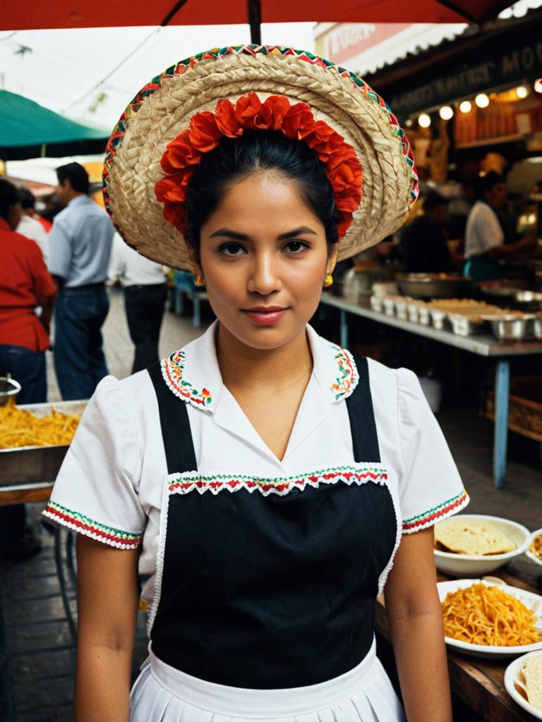 Photorealistic portrait of a young Mexican woman wearing a traditional waitress costume, including a white blouse with embroidered details, a black apron, and a large woven straw hat. She stands outdoors in a busy market setting with food stalls and people in the background.
