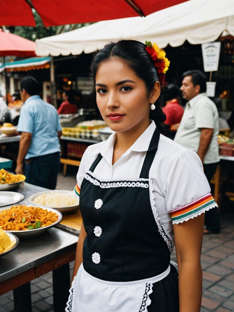 Woman in Mexican Waitress Costume, photorealistic outdoor portrait in market setting