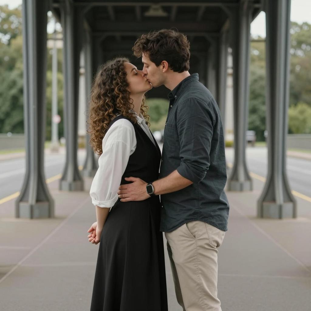 Two people standing on a stone balcony at sunset. Woman with short brown hair, green sleeveless top, hands on railing. Man with dark hair, blue shirt, black pants, right hand on waist, smiling. Large tree in center, green field, hills in background. Orange sunset light behind tree.