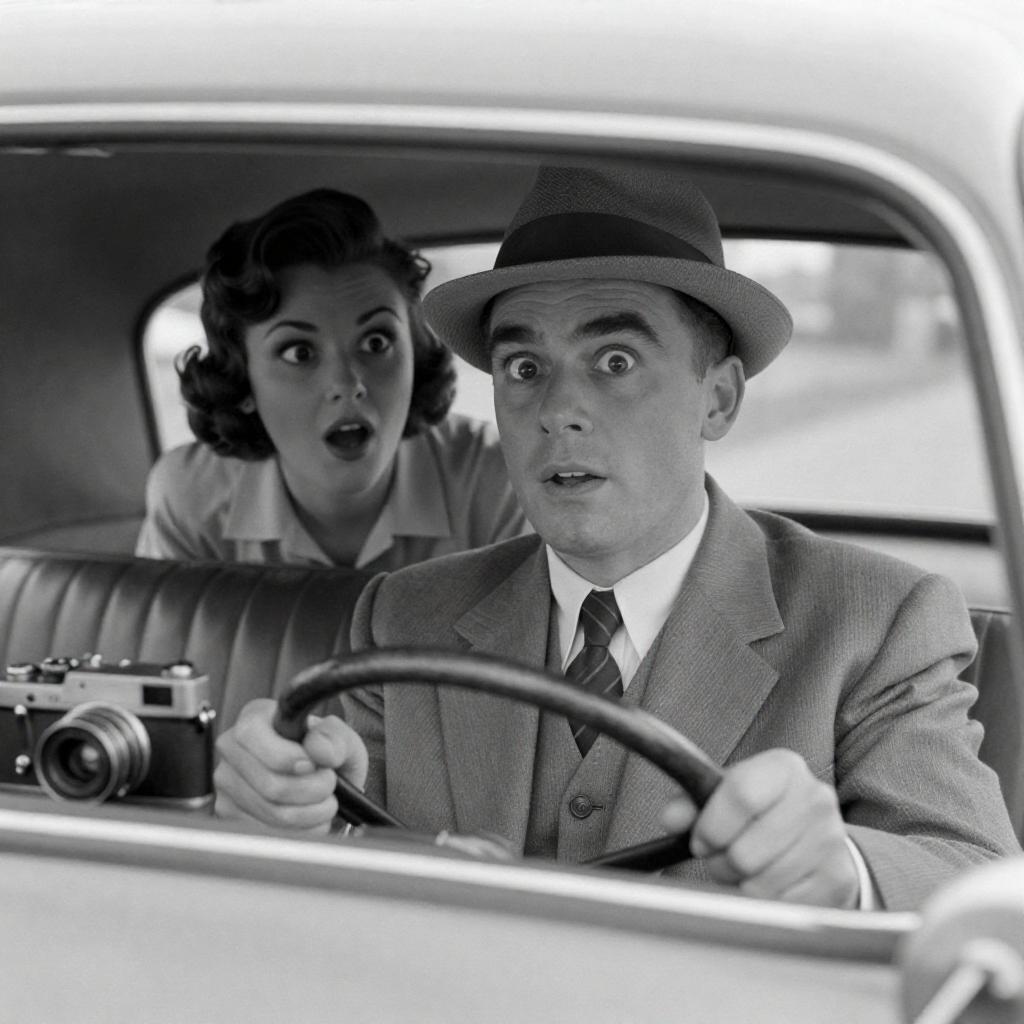 Black-and-white photograph of a man in a "Yellow Cab" hat and suit, driving a car, with a surprised woman leaning over him from behind. Both have wide-eyed expressions. Vintage car interior with a large camera on the left.