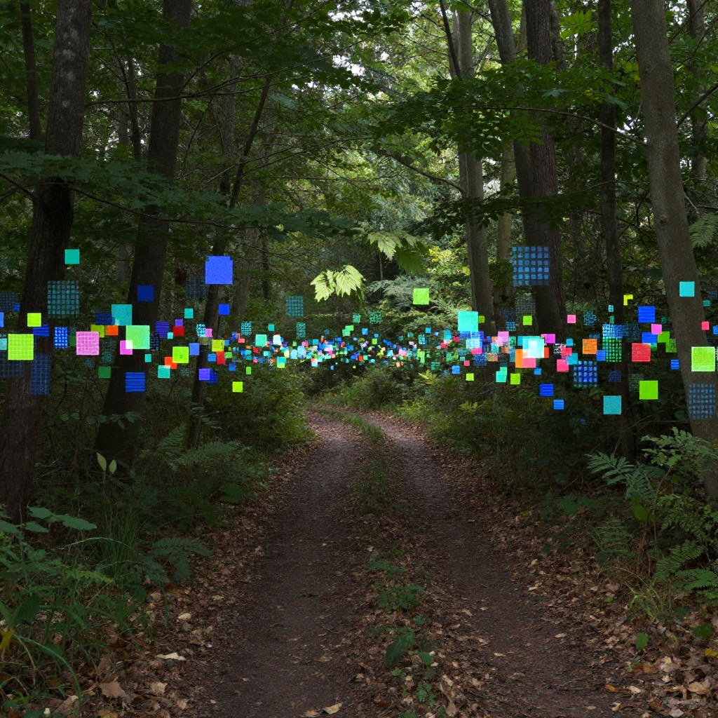 Photograph of a forest path with a dirt trail winding through dense greenery. The path is flanked by tall trees with thick trunks and lush foliage. Bright, colorful, digital pixel squares, in shades of blue, green, red, and yellow, are scattered throughout the forest, creating a vivid contrast against the natural greenery. The pixel squares are semi-transparent and float in mid-air. The forest floor is covered with fallen leaves, adding texture to the path. Dappled sunlight filters through the trees, highlighting the vibrant pixels and creating a whimsical, almost magical atmosphere in the natural setting.