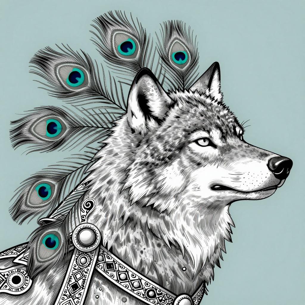 Illustration of a wolf-like creature with a regal, upward gaze. The creature has peacock feathers on its head and shoulders, with intricate, ornate ribbons. Monochrome with teal background. Detailed line art. Wolf's ears pointed, eyes narrowed. Peacock feathers have visible eye patterns. Upper body and head in profile view.