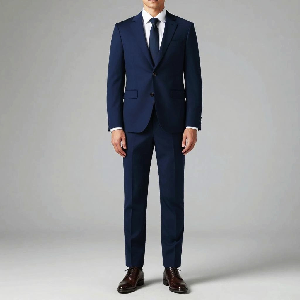 A confident man stands poised in a sleek, tailored suit featuring a deep blue hue, exemplifying modern elegance and style. The well-fitted attire, complemented by polished leather shoes, highlights a sophisticated fashion sense ideal for professional or formal occasions.