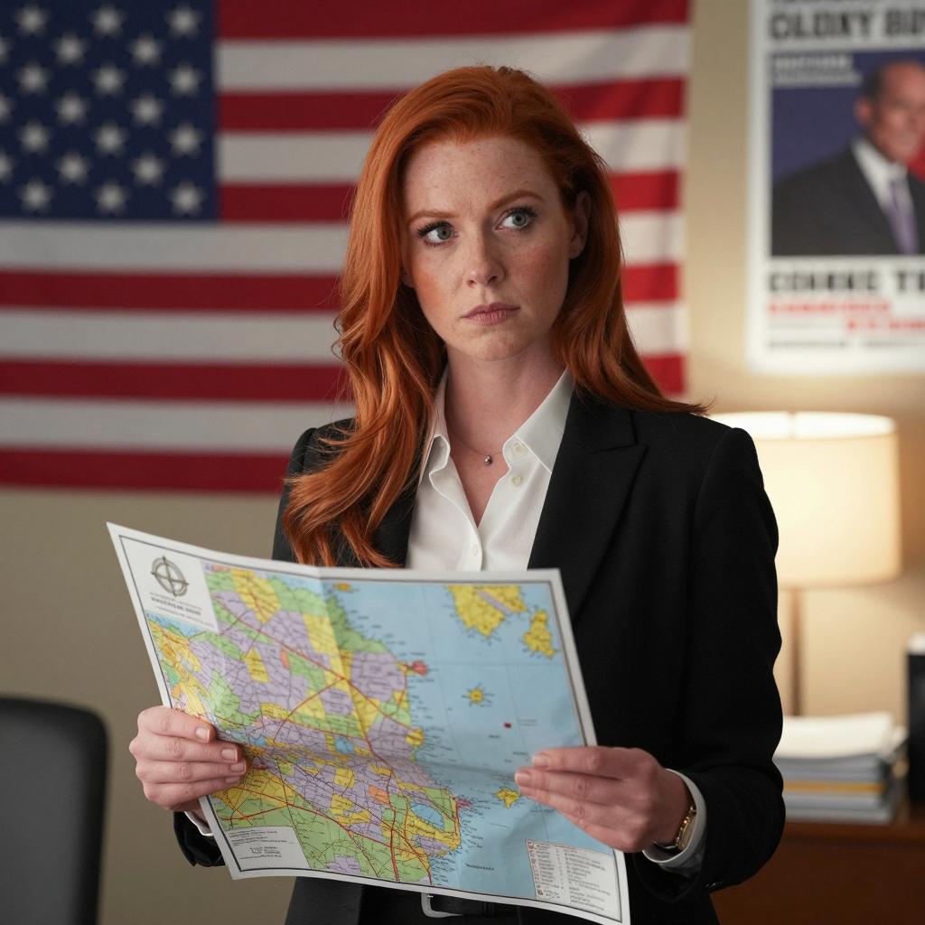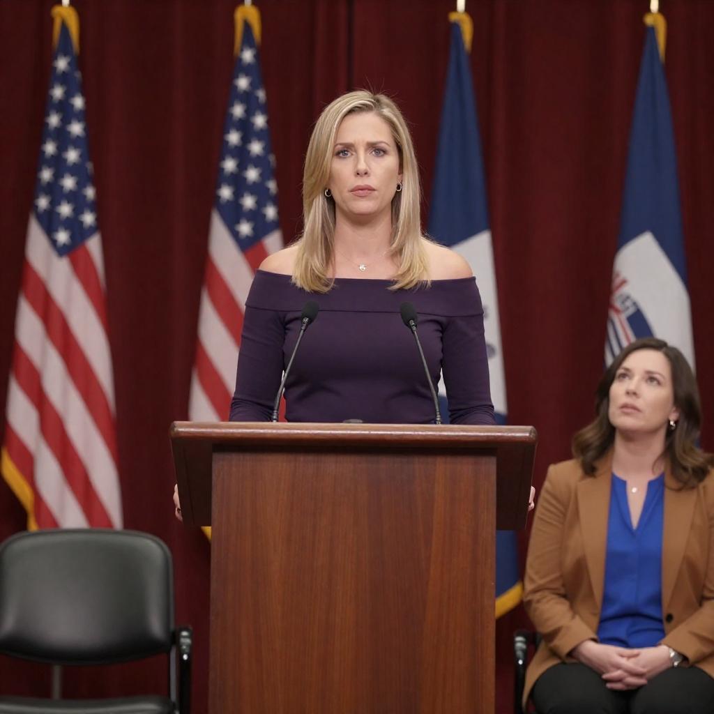 Photograph of a public speaking event. Blonde woman with light skin, off-shoulder purple top, standing at podium, serious expression. Brown-haired woman in blue top, brown jacket, sitting to the right, looking up at speaker. Red curtain background. American flag and other flag on stands. Two black chairs in front of podium.