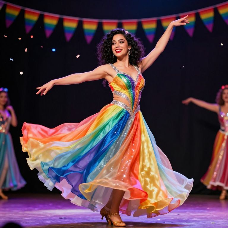 A joyful female performer with curly black hair and bright hazel eyes wearing a flowing queen rainbow dress with customizable color sections that shift subtly under the light, performing a glittery ballroom dance on a stage at a rainbow-themed celebration with rainbow flags and confetti swirling in the air.