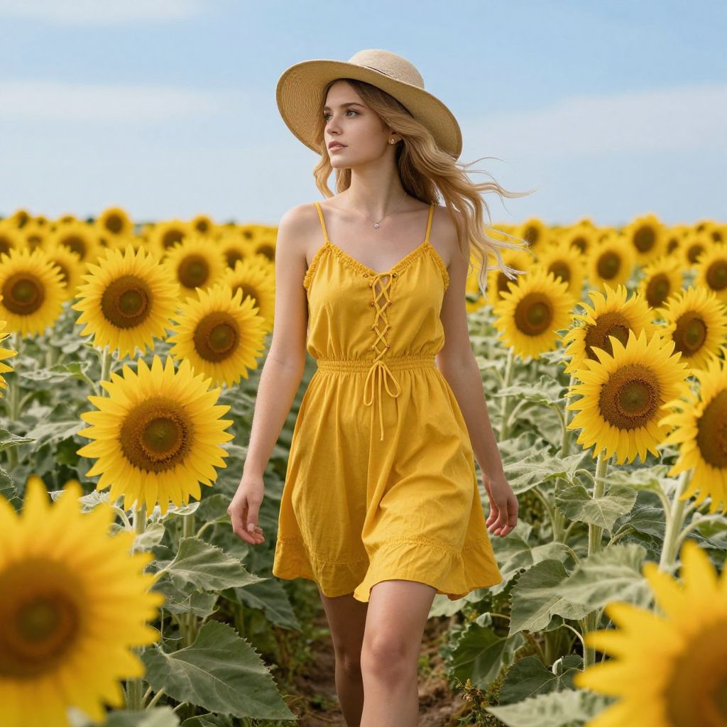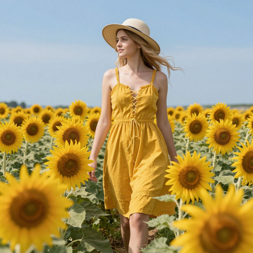 Photograph of a young woman with fair skin and long, light brown hair, wearing a wide-brimmed beige straw hat and a sleeveless, yellow sundress with lace-up front and ruffled skirt. She is walking through a vibrant sunflower field under a clear, bright blue sky. The sunflowers, with large yellow petals and dark brown centers, surround her, creating a lush, colorful backdrop. The woman's expression is serene, and her gaze is directed slightly to the right. The sunlight casts a warm, golden glow, enhancing the vivid colors of the scene.