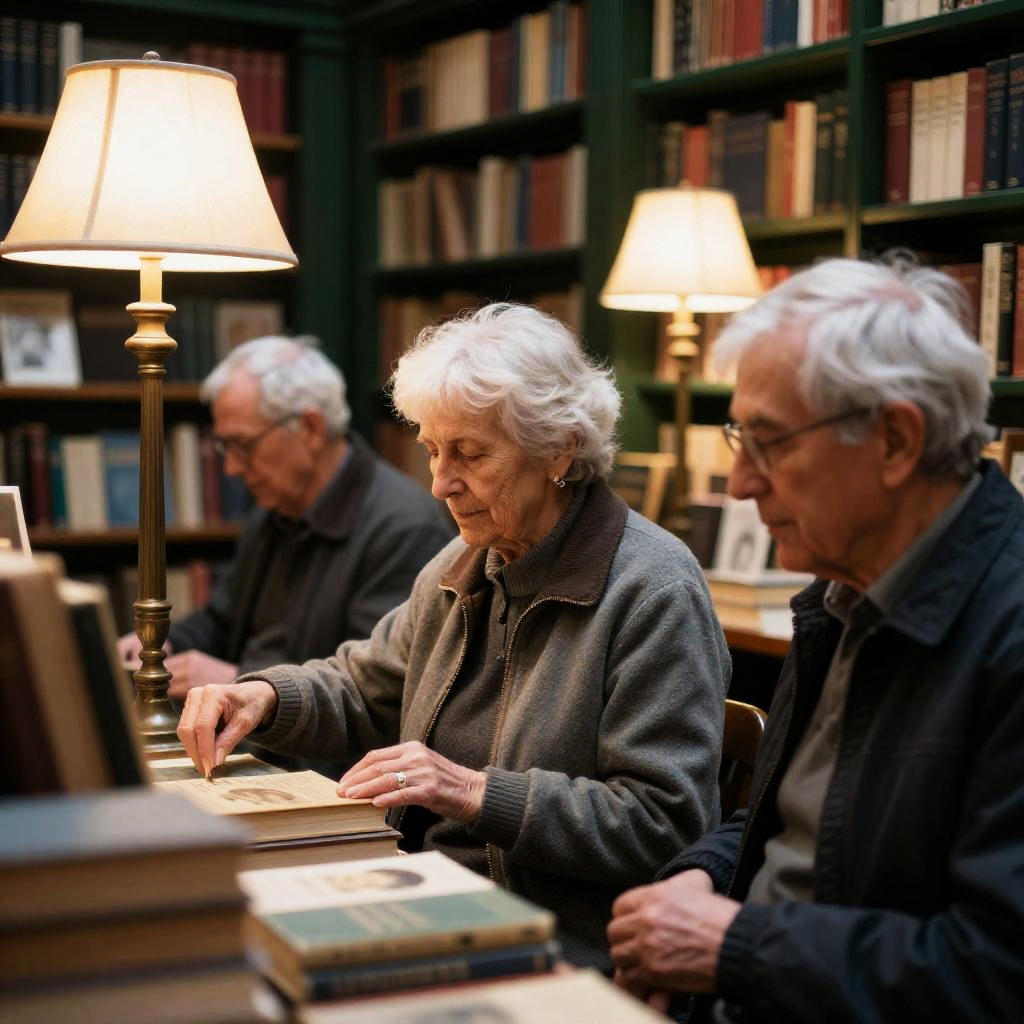 Realistic photo.London bookshop, Hispanic and Caucasian elderly customers, detailed faces, vintage books as decor, deep green and cream, lit by soft vintage lamps, HD, photorealistic. realistic photo
