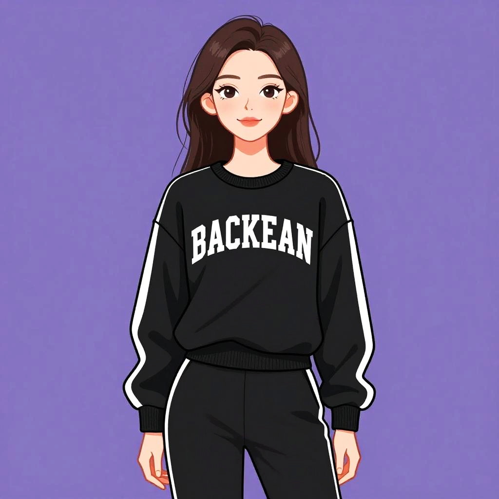 Woman with pretty face and pretty hair. Woman, casual sporty, black crew neck sweatshirt with white lettering across the chest, dropped shoulders, long sleeves with white stripe detail, matching black track pants with white side stripes, plain black waistband, straight-fit, simple hairstyle, neutral studio background --sref 1467