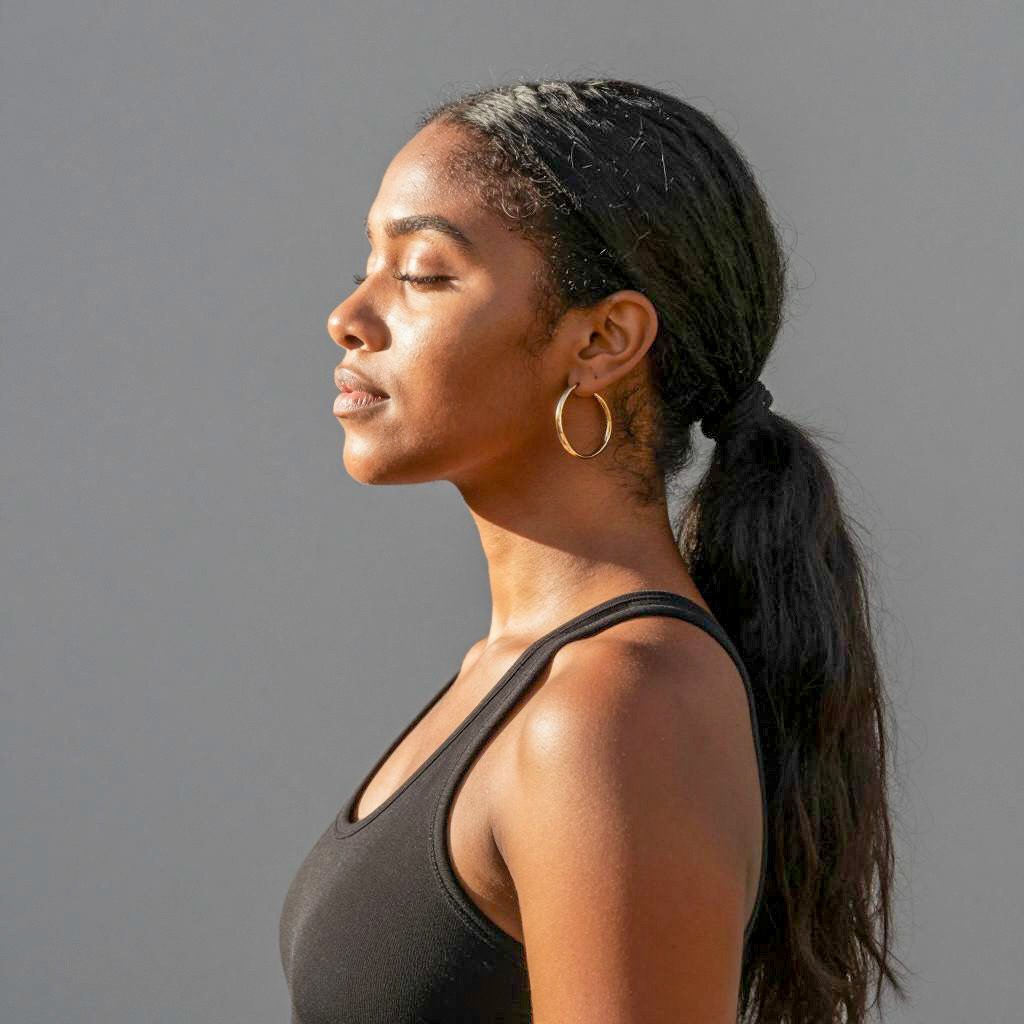 Photograph of a young woman with light brown skin, long curly black hair, and closed eyes. She wears a red short-sleeved top and a bejeweled belt. Her right hand rests on her chest, left arm crosses her body. Red background, soft shadows. Her expression is serene, lips slightly parted. She has long earrings, a ring on her right hand, and a bracelet on her left wrist. Her nails are painted pink.