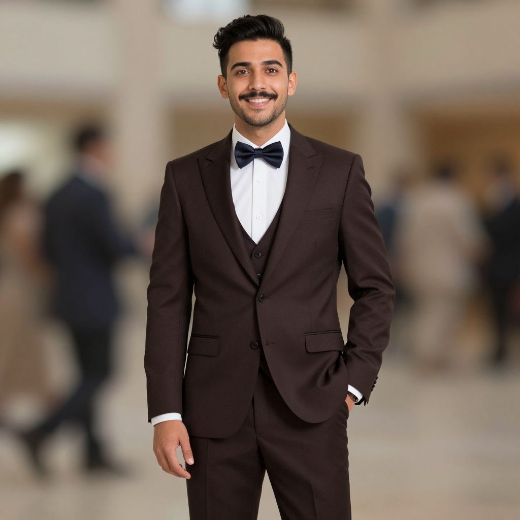 Birthday fancy dress theme, 1boy, male focus, solo, bowtie, bow, mustache, hand in pocket, black hair, facial hair, formal, suit, jacket, pants, vest, blurry, looking at viewer, shirt, smile, traditional bowtie, blurry background, tuxedo, brown jacket, white shirt