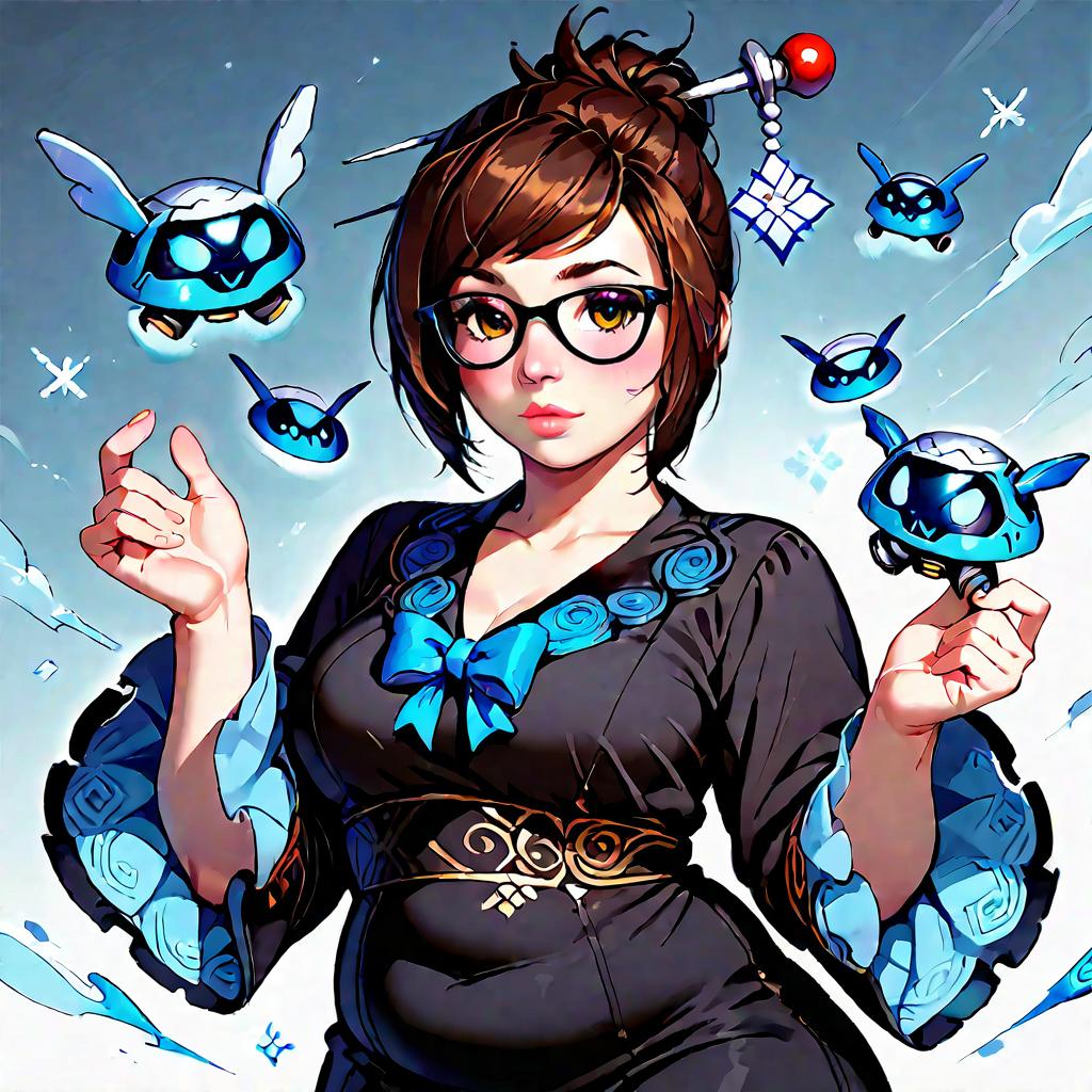 Score_9, score_8_up, score_7_up, score_6_up, score_5_up, score_4_up, (source_anime), Overwatch_Mei, Overwatch, Mei, Brown Hair, Blue eyes, glasses, looking at viewer, Chubby, 1girl, zPDXL, ((formal_dress)), black dress