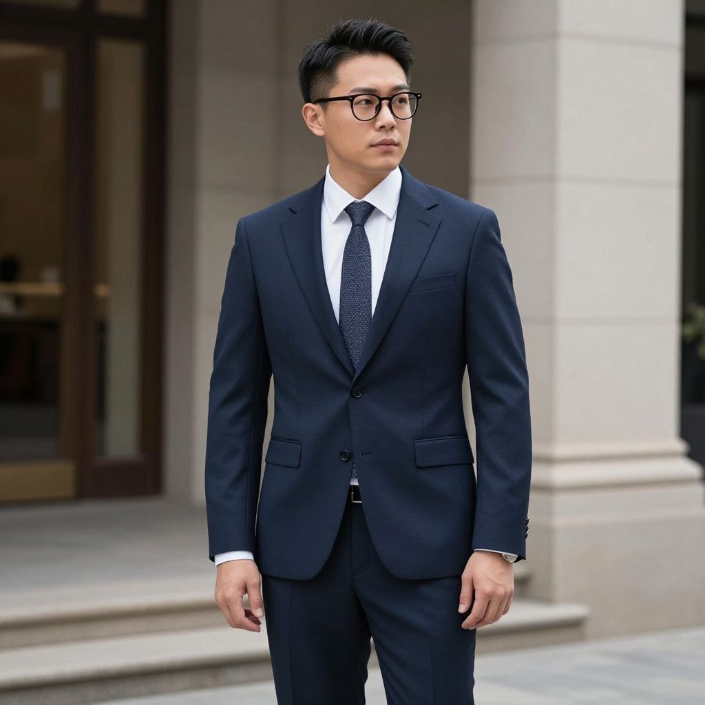 Smart Casual Business Attire Male Costume, man in a suit and glasses standing outside