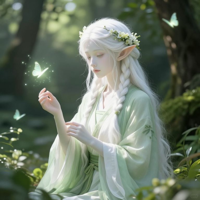 Digital fantasy artwork of a pale, white-haired elf woman with pointed ears, green robe, flower crown, gently touching a glowing butterfly in a sunlit