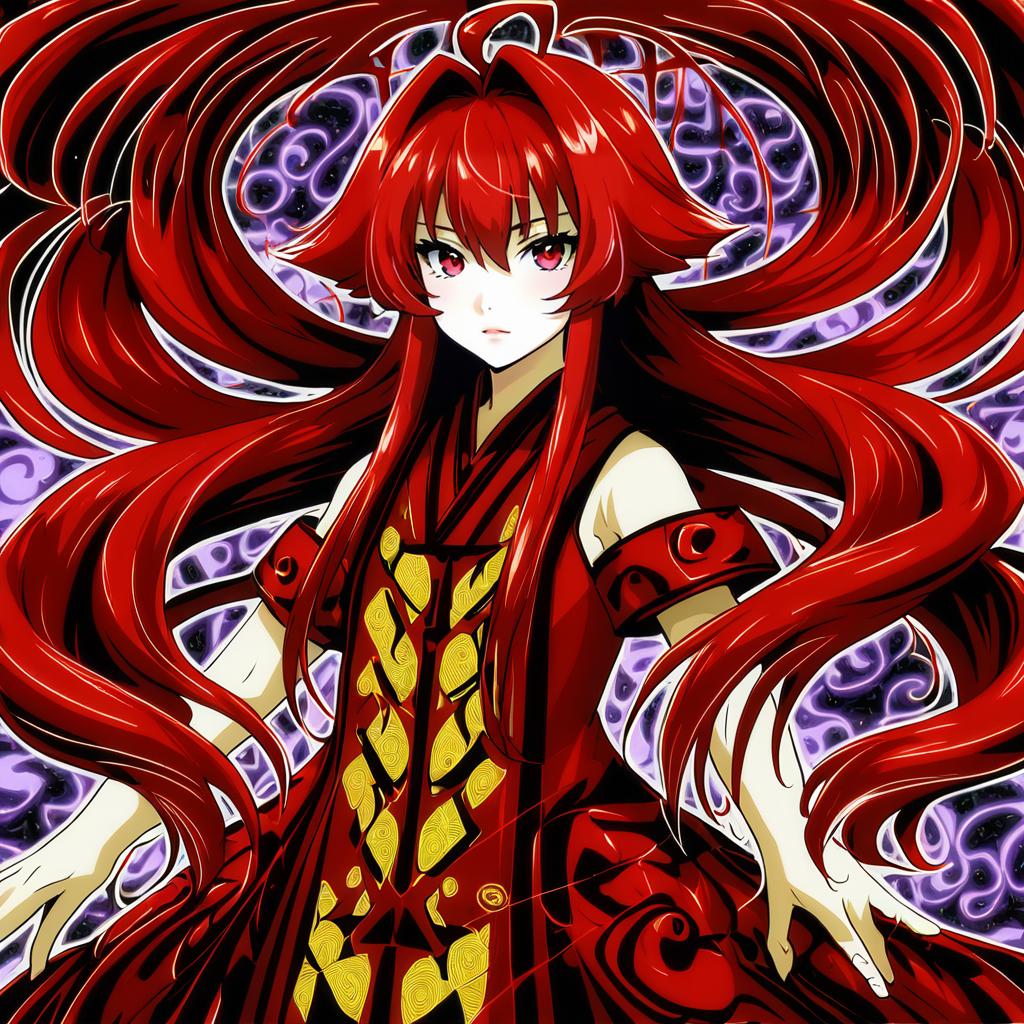 Digital anime-style illustration of a young female character with very long flowing red hair styled in ponytails and hair intakes, red eyes, and a single ahoge. She is wearing an ornate red and yellow outfit with arm cuffs, set against a swirling purple background.