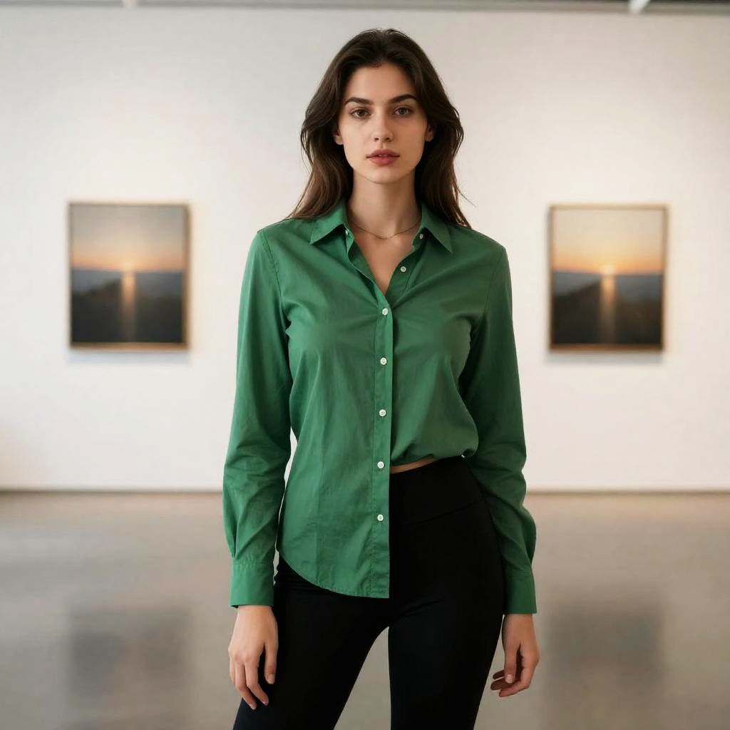 Best quality, masterpiece, ultra high res, (photorealistic:1.4), raw photo, 1girl, breasts, thighs, hip, beautiful face, Green button-up shirt, black leggings, gallery, cold light, reflected, dusk