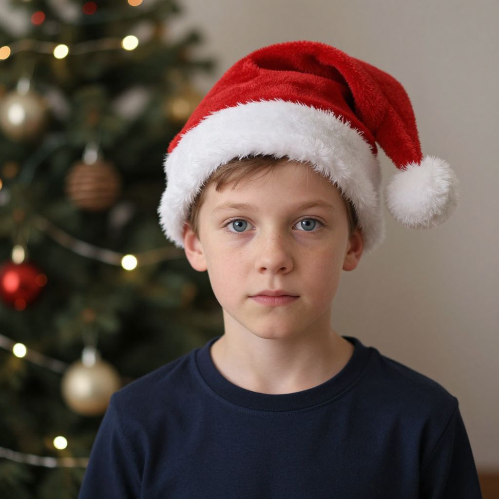 Christmas light bulb adult, hat, solo, 1boy, looking at viewer, male focus, christmas tree, blurry, christmas, blurry background, realistic, upper body, blue eyes