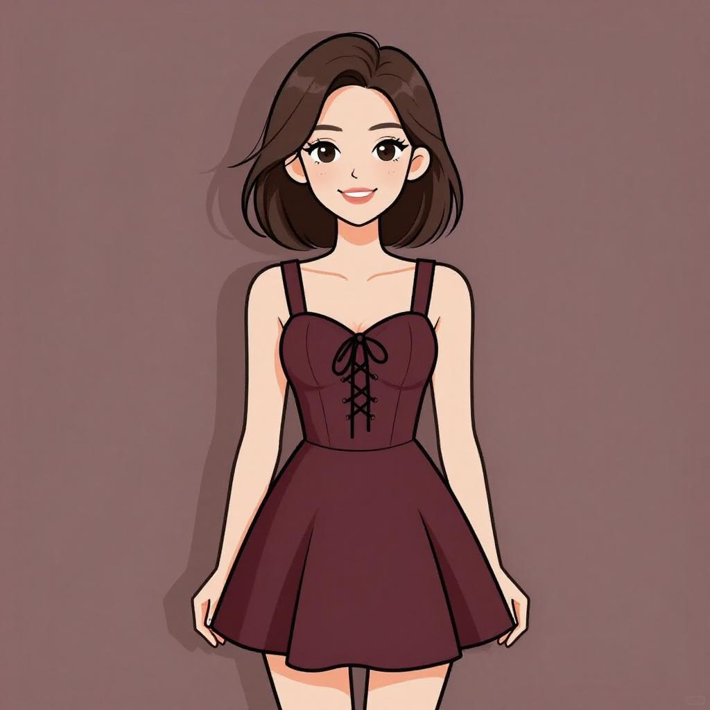 Digital drawing of an anime-style young woman with fair skin and shoulder-length dark brown hair. She has large, expressive brown eyes and a slight smile. She's wearing a sleeveless, deep maroon dress with a fitted, laced-up bodice and a flared skirt that ends mid-thigh. The background is a solid, muted purple. The image has a clean, cartoonish style with simple, bold lines and flat colors, emphasizing her cheerful expression and stylish outfit.
