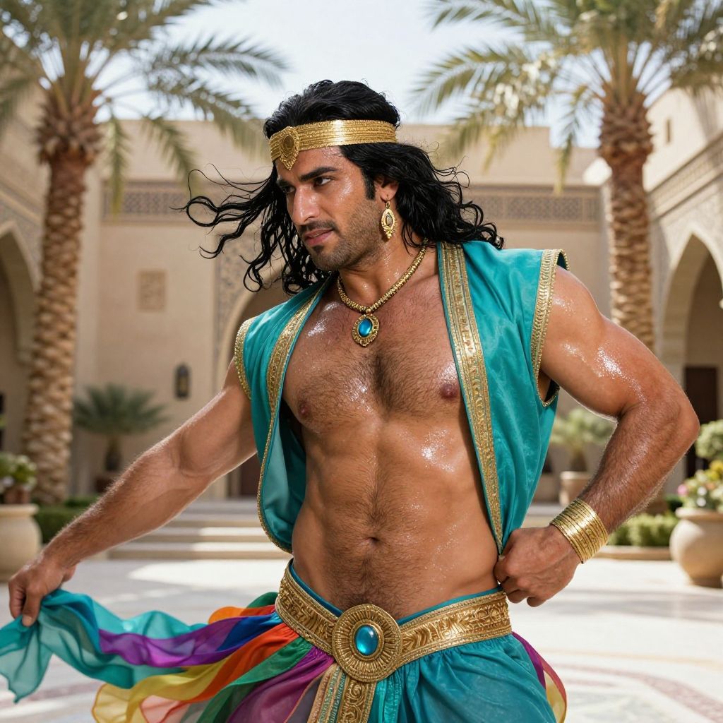Photograph of a muscular, tan-skinned man with long, wet, black hair, wearing a gold headband and earrings, a teal and gold draped cloth exposing his chest and abs, and a colorful, rainbow skirt with a gold and turquoise belt. He has a blue gemstone necklace and bracelet. The background features a sunlit courtyard with palm trees and arched buildings. His expression is focused, and his pose is dynamic, with one hand gripping his skirt. The image has a vibrant, almost hyper-realistic style, emphasizing the richness of the colors and textures.