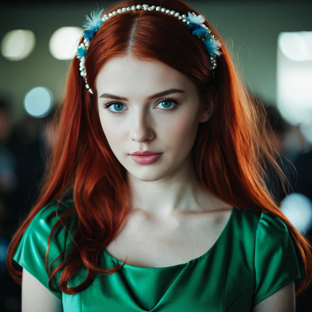Close-up portrait of a young woman with long red hair, piercing blue eyes, and fair skin wearing a green dress with short sleeves. She has a pearl and blue floral headband as a hair ornament. The background is blurred, emphasizing her face and upper body.