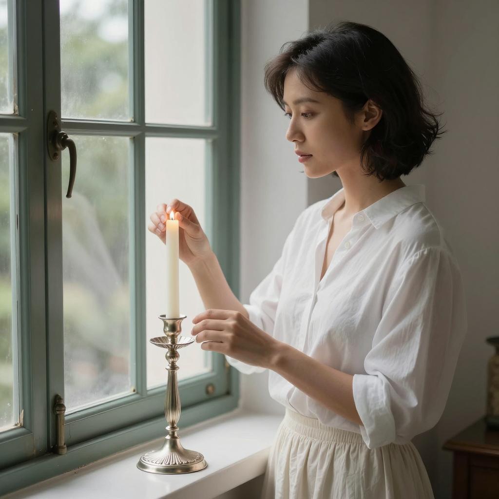 A woman with short dark hair, wearing a white blouse and skirt, standing at a window. She holds a delicate candleholder with a single candle, adjusting the candle's wick. Window frame is dark. Her expression is focused. The candleholder is on a windowsill.