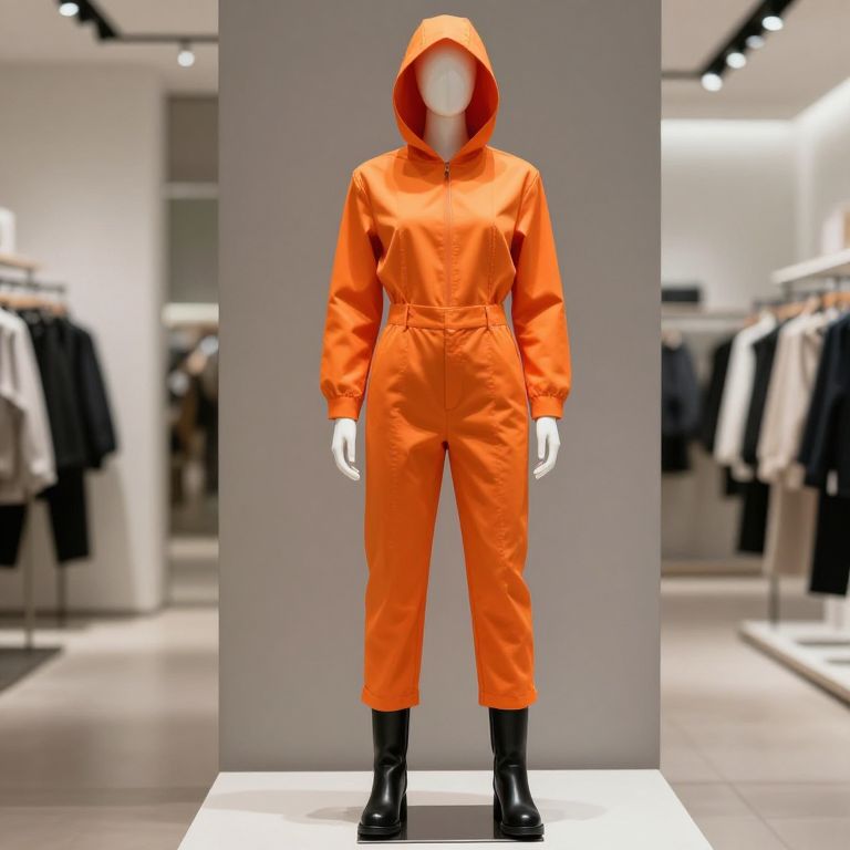 A mannequin wearing an orange outfit with a hood and a tie, standing in a modern retail store setting, with sleek, minimalist furniture and soft natural lighting highlighting the vibrant colors of the outfit. The mannequin has a clean, smooth, lifeless form typical of store displays, with a slightly reflective surface that catches the light, and the orange hood and tie stand out against the neutral background, creating a bold and eye-catching visual. The scene is realistic and styled with a fashion-forward, contemporary aesthetic.