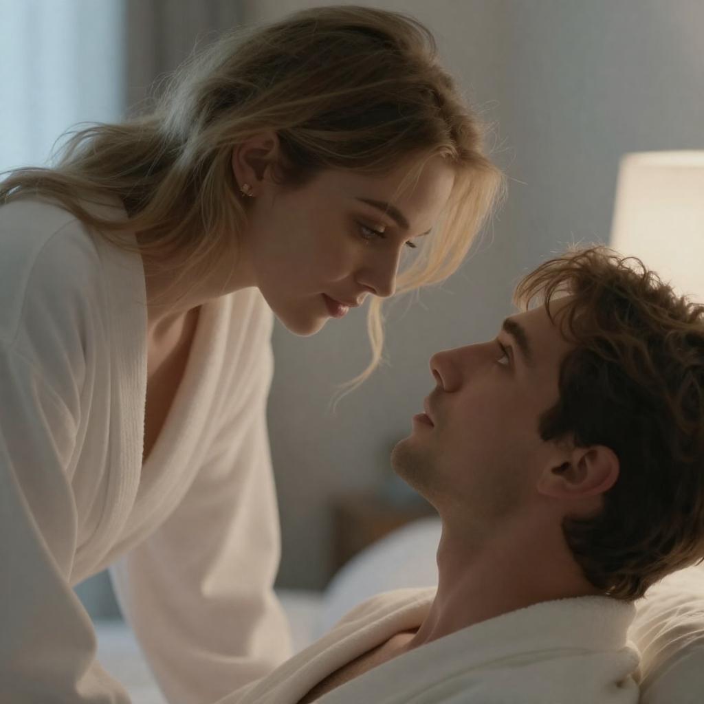 Photograph of a close-up, intimate moment between a man and woman. The woman, with tousled blonde hair and a white robe, leans forward, eyes locked on the man. The man, with short brown hair and a serious expression, gazes up at her. Soft blue and yellow lighting in the background creates a warm, romantic atmosphere.