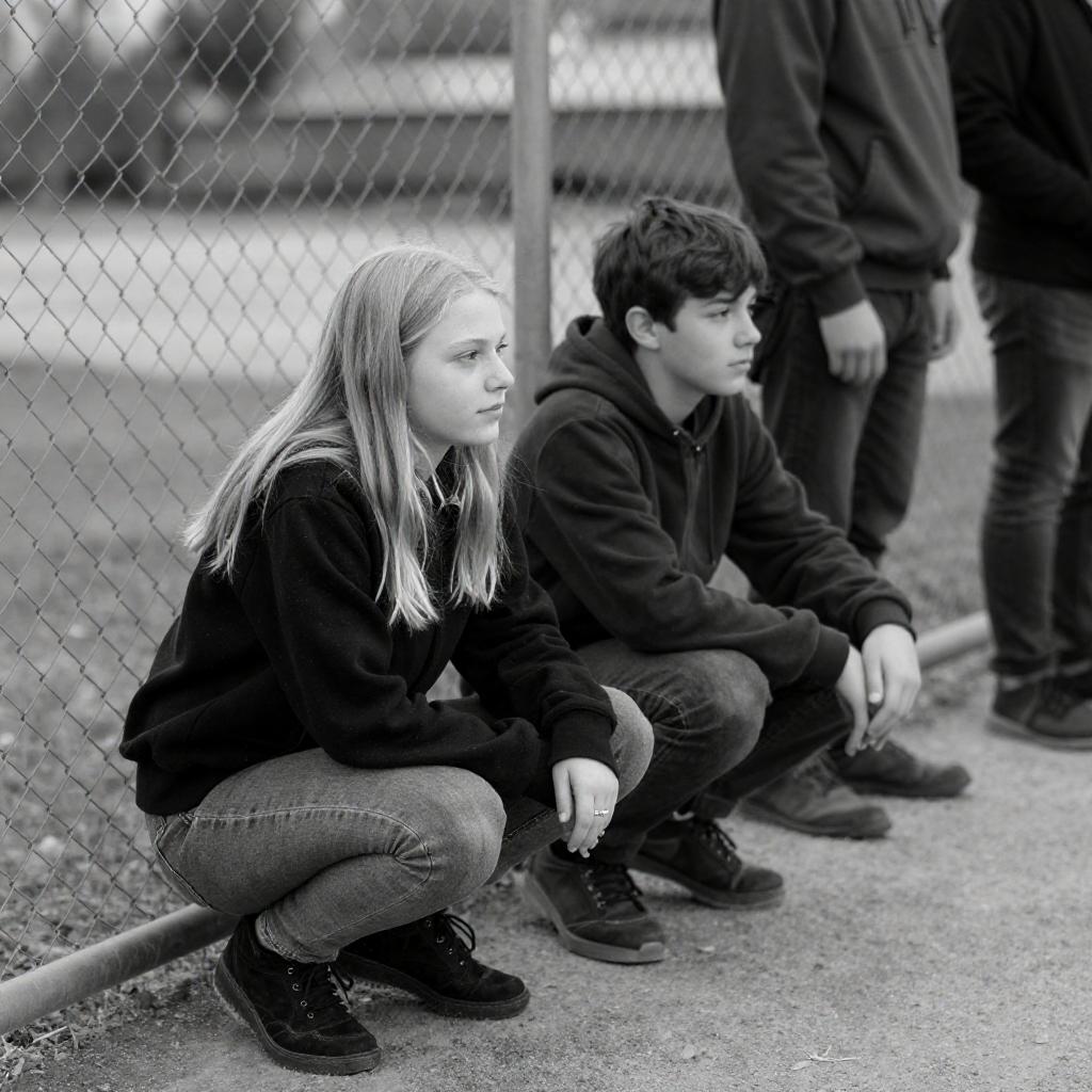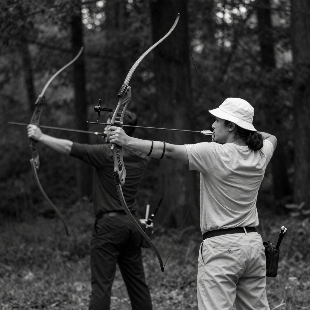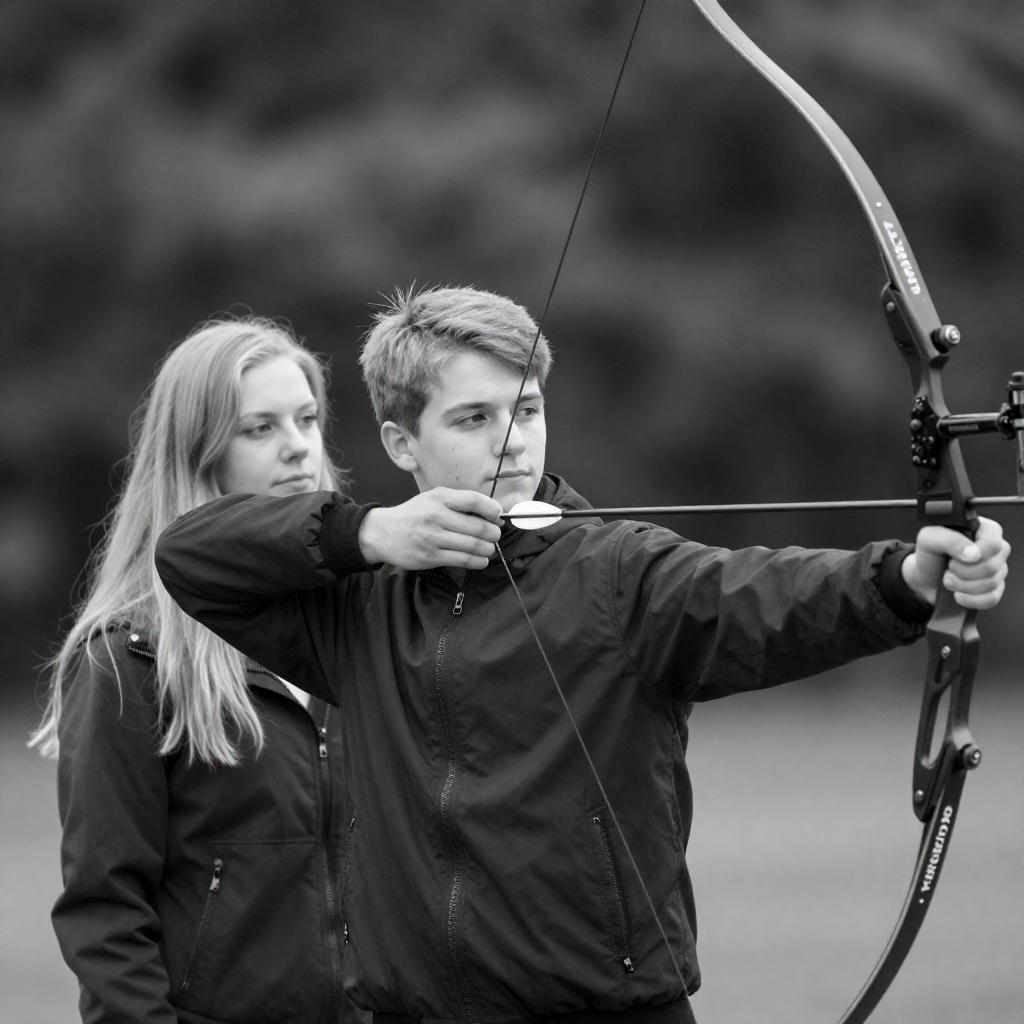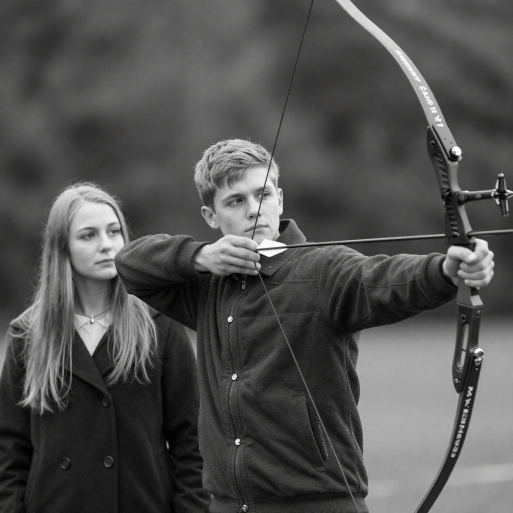 Black-and-white photograph of a young man with short, light hair and a young woman with long, blonde hair. The man, wearing a dark jacket, is drawing a bow, aiming forward. The woman, also in a dark jacket, stands closely behind him. They are outdoors with a blurred tree-filled background.